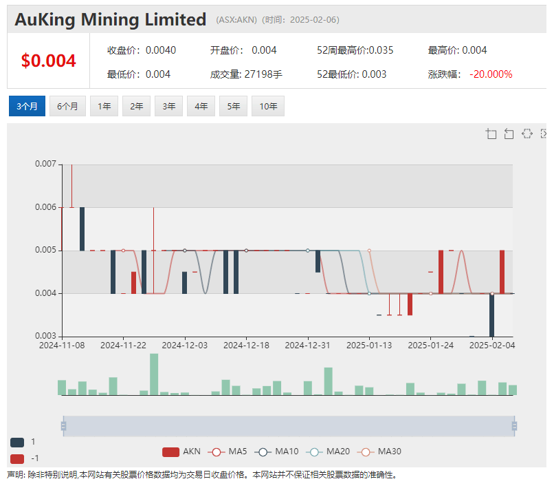 澳洲矿业勘探公司 Auking Mining Ltd (ASX股票代码:AKN)宣布与 中国投资机构——北京疆亘资本管理有限公司(Gage Capital Management Co.,Ltd)达成战略交易。周三AKN澳交所股价应声暴涨66.67%,报于0.005澳元,日成交量344万股。