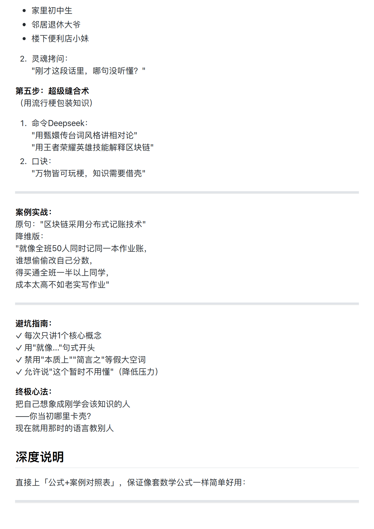 知识脱衣服:用8岁小孩能懂的话解释复杂概念,同时添加关键咒语,要求禁用术语,用菜市场或打游戏等常见场景举例,去除专业术语包装。