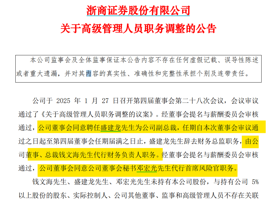 1月27日,浙商证券官宣,由 公司党委书记、总裁钱文海代行财务负责人职责, 原财务总监盛建龙担任副总裁。公告还显示,由董事会秘书邓宏光接替张晖,代行首席风险官职务。